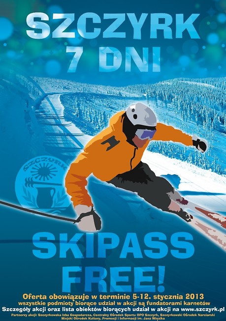 Zapraszamy do udziału w akcji SZCZYRK 7 DNI - SKIPASS FREE! Korzystając z 7 noclegów w terminie od 5 do 12 stycznia 2013 roku w jednym wymienionych poniżej obiektów otrzymujesz sześciodniowy SkiPass za darmo. Do wyboru wyciągi Centalnego Ośrodka Sportu oraz Szczyrkowskiego Ośrodka Narciarskiego.